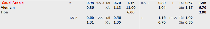 - Mức kèo nhà cái cược chấp trận này: Ả Rập Saudi chấp 2 Trái. Ả Rập Saudi ăn 0,98. Việt Nam ăn 0,86