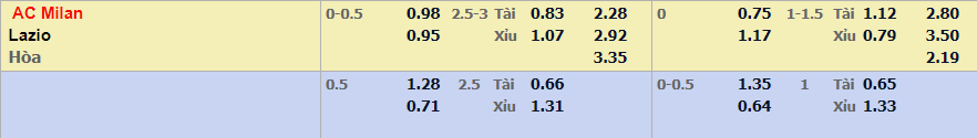 - Mức kèo nhà cái đưa ra trận này: AC Milan chấp 0,25 Trái. AC Milan ăn 0,98. Lazio ăn 0,95