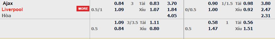 - Mức kèo nhà cái cược chấp trận này: Liverpool chấp 0,75 trái. Ajax ăn 0,84. Liverpool ăn 1,09