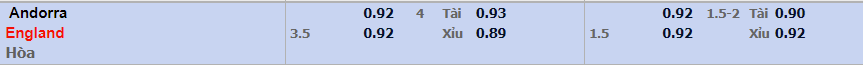 - Mức kèo nhà cái đưa ra trận này: Anh chấp 3,5 Trái. Andorra ăn 0,92. Anh ăn 0,92