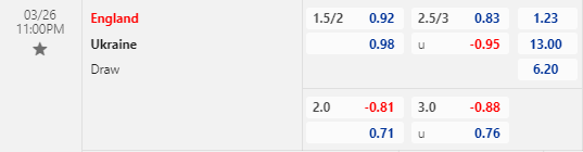 Tỷ lệ kèo bóng đá Anh vs Ukraine – 23h00 – 26/03/2023