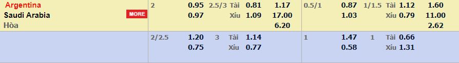 - Mức kèo nhà cái cược chấp trận này: Argentina chấp 2 trái. Argentina ăn 0,95. Ả Rập Saudi ăn 0,97