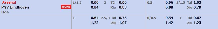 - Mức kèo nhà cái 188bet cược chấp trận này: Arsenal chấp 1,25 Trái. Arsenal ăn 0,90. PSV ăn 0,94