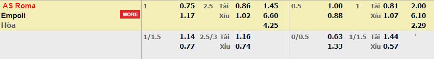 - Mức kèo nhà cái cược chấp trận này: AS Roma chấp 1 trái. AS Roma ăn 0,74. Empoli ăn 1,17