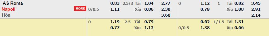 - Mức kèo nhà cái cược chấp trận này: Napoli chấp 0,25 trái. Roma ăn 0,83. Napoli ăn 1,11
