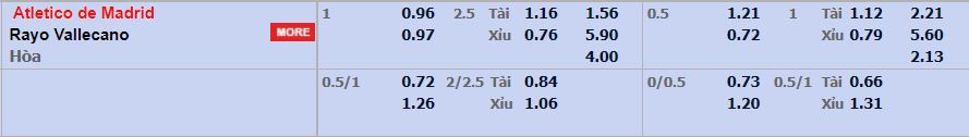 - Mức kèo nhà cái cược chấp trận này: Atl Madrid chấp 1 trái. Atl Madrid ăn 0,96. Rayo Vallecano ăn 0,97