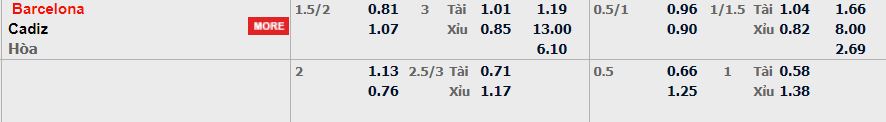 - Mức kèo nhà cái cược chấp trận này tại bảng kèo bet69: Barcelona chấp 1,75 Trái. Barcelona ăn 0,81. Cadiz ăn 1,07