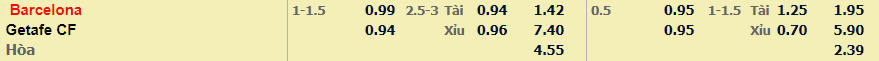 - Mức kèo nhà cái, tỷ lệ kèo bóng đá cược chấp trận này: Barcelona chấp 1,25 Trái. Barcelona ăn 0,99. Getafe ăn 0,94