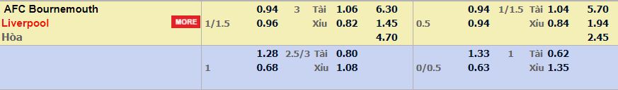 - Mức kèo nhà cái cược chấp trận này: Liverpool chấp 1,25 Trái. Bounremouth ăn 0,94. Liverpool ăn 0,96
