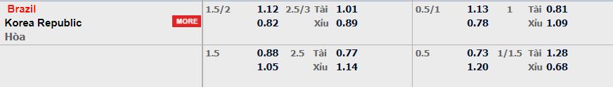 Kèo châu Á trong trận đấu này được nhà cái đưa ra ở mức chấp 1,75 nghiêng về phía tuyển Brazil. Thông số đã chỉ ra đại diện Nam Mỹ đã thắng 4 trận gần đây khi gặp Hàn Quốc trên mọi đấu trường và trong 4 trận này, Selecao ghi ít nhất 2 bàn mỗi trận. Ngoài ra, 2 trận đấu gần đây với Hàn Quốc, Brazil đều đã thắng với cách biệt từ 3 bàn. Và với sức mạnh đồng đều ở cả 3 tuyến như ở thời điểm hiện tại, Brazil sẽ giành chiến thắng và vượt thành công kèo chấp 1,75. Còn tỷ lệ tài xỉu đang ở mức 2,75 bàn cả trận. Với việc Brazil đã ghi tới 10 bàn trong 3 trận gần nhất gặp Hàn Quốc, thêm nữa là 2 trận gần nhất của Hàn Quốc đều kết thúc trận với kết quả tài thì trận cầu sắp tới giữa 2 đội rất có khả năng sẽ có nhiều bàn thắng. Chọn tài.