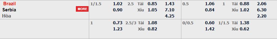 - Mức kèo nhà cái World Cup cược chấp trận này: Brazil chấp 1,25 trái. Brazil ăn 1,02. Serbia ăn 0,90