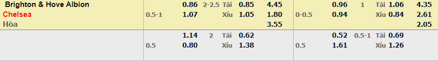 - Mức kèo nhà cái cược chấp trận này: Chelsea chấp 0,75 Trái. Brighton ăn 0,86. Chelsea ăn 1,07