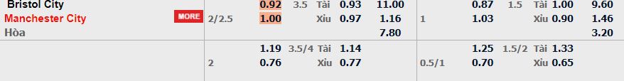 - Mức kèo nhà cái cược chấp trận này: Manchester City chấp 2,25 Trái. Bristol City ăn 0,92. Manchester Cityăn 1,00