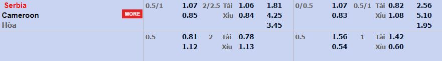 Soi kèo tài xỉu, sau lượt trận đầu tiên có thể thấy Cameroon và Serbia đều có hàng thủ kỉ luật và chỉ để thua ở những tình huống mà đối thủ quá lấn lướt. Do đó lựa chọn kèo xỉu cho trận đấu này sẽ là lưa chọn hiệu quả cho người chơi. Về kèo châu Á, tỉ lệ -0.5/1 đang là lựa chọn của nhiều chuyên gia bởi đầu ra bàn thắng của hai đội bóng vẫn còn đang gặp vấn đề.