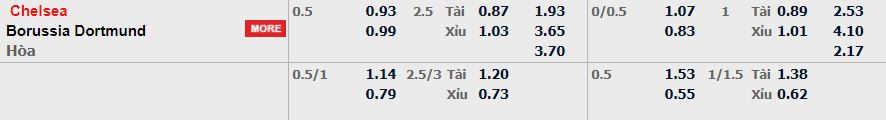 - Mức kèo nhà cái cược chấp trận này: Chelsea chấp 0,5 Trái. Chelsea ăn 0,93. Dortmund ăn 0,99