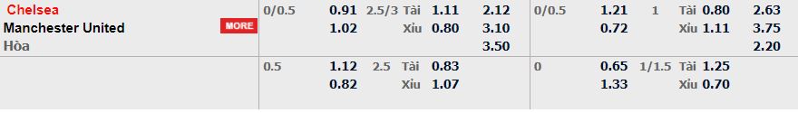 - Mức kèo nhà cái cược chấp trận này: Chelsea chấp 0,25 trái. Chelsea ăn 0,91. Manchester Utd ăn 1,02