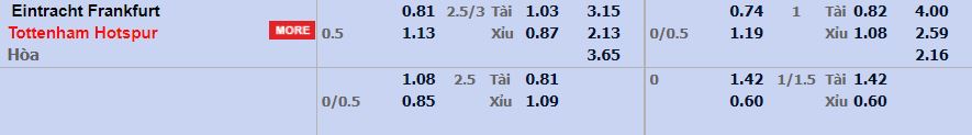 - Mức kèo nhà cái cược chấp trận này: Tottenham chấp 0,5 Trái. Frankfurt ăn 0,81. Tottenham ăn 1,13