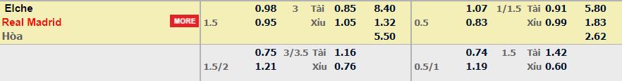 - Mức kèo nhà cái cược chấp trận này: Real Madrid chấp 1,5 trái. Elche ăn 0,98. Real Madrid ăn 0,95
