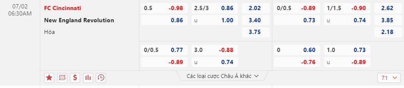 - Mức kèo nhà cái cược chấp trận này: FC Cincinnati chấp 0,5 Trái. FC Cincinnati ăn 1,00. New England Revolution ăn 0,86