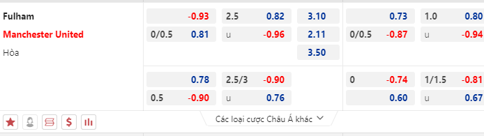 - Mức kèo nhà cái cược chấp trận này: Manchester Utd hấp 0,25 Trái. Fulham ăn 1,00. Manchester Utd ăn 0,81