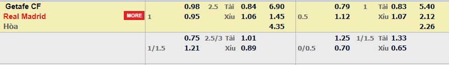 - Mức kèo nhà cái cược chấp trận này: Real Madrid chấp 1 trái. Getafe ăn 0,98. Real Madrid ăn 0,95