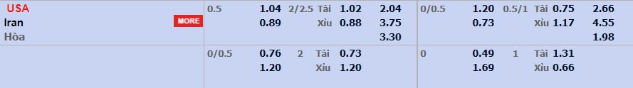 - Mức kèo nhà cái cược chấp trận này: Mỹ chấp 0,5 trái. Mỹ ăn 1,04. Iran ăn 0,89