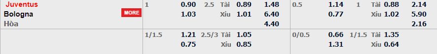 - Mức kèo nhà cái cược chấp trận này: Juventus chấp 1 Trái. Juventus ăn 0,90. Bologna ăn 1,03