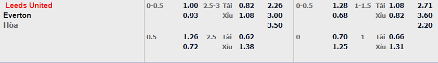 - Mức kèo nhà cái đưa ra trận này: Leeds Utd chấp 0,25 Trái. Leeds Utd ăn 1,00. Everton ăn 0,93