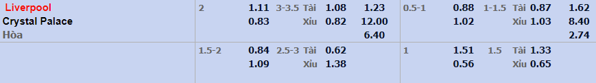 - Mức kèo nhà cái cược chấp trận này: Liverpool chấp 2 Trái. Liverpool ăn 1,11. Crystal Palace ăn 0,83