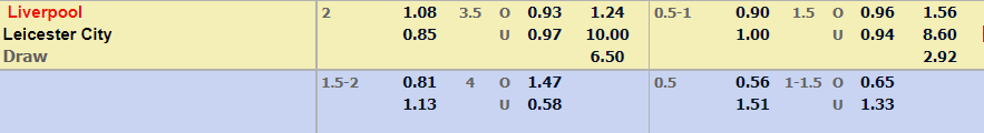 - Mức kèo nhà cái cược chấp trận này: Liverpool chấp 2 Trái. Liverpool ăn 1,08. Leicester City ăn 0,85