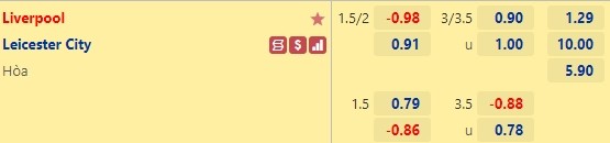 - Mức kèo nhà cái cược chấp trận này: Liverpool chấp 1,75 Trái. Liverpool ăn 1,00. Leicester City ăn 0,91