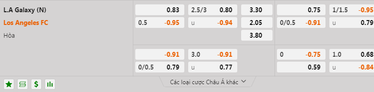 - Mức kèo nhà cái cược chấp trận này: Los Angeles chấp 0,5 Trái. L.A Galaxy ăn 0,83. Los Angeles ăn 1,00
