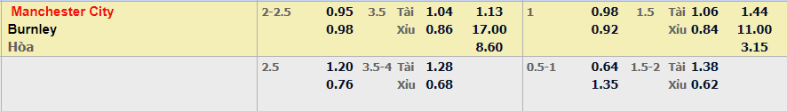 - Mức kèo nhà cái cược chấp trận này: Manchester City chấp 2,25 Trái. Manchester City ăn 0,95. Burnley ăn 0,98
