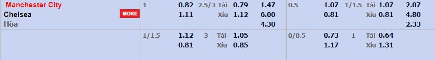- Mức kèo nhà cái cược chấp trận này: Manchester City chấp 1 trái. Manchester City ăn 0,82. Chelsea ăn 1,11