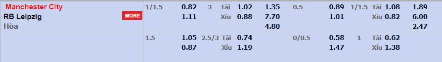 - Mức kèo nhà cái cược chấp trận này: Manchester City chấp 1,5 Trái. Man City ăn 1,05. RB Leipzig ăn 0,87