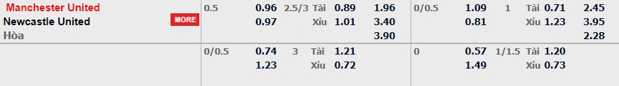 - Mức kèo nhà cái cược chấp trận này: Man Utd chấp 0,5 trái. Man Utd ăn 0,96. Newcastle ăn 0,97