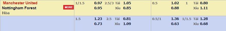 - Mức kèo nhà cái cược chấp trận này: Man Utd chấp 1,25 Trái. Man Utd ăn 0,97. Nottingham ăn 0,95