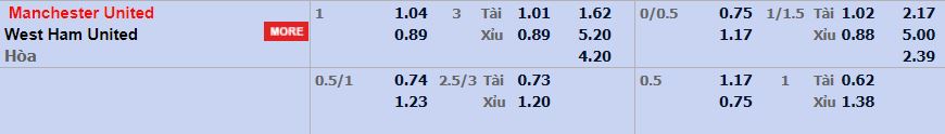 - Mức kèo nhà cái cược chấp trận này: Manchester Utd chấp 1 trái. Manchester Utd ăn 1,04. West Ham ăn 0,89