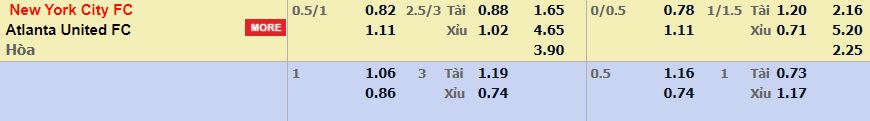 - Mức kèo nhà cái cược chấp trận này: New York City chấp 0,75 Trái. New York City ăn 0,82. Atlanta Utd ăn 1,11
