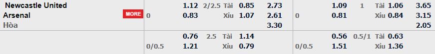 - Mức kèo nhà cái cược chấp trận này: Hòa – Được – Thua. Newcastle ăn 1,12. Arsenal ăn 0,83