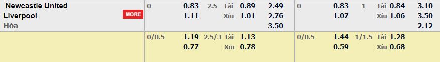 - Mức kèo nhà cái cược chấp trận này: Hòa – Được – Thua. Newcastle ăn 0,83. Liverpool ăn 1,11