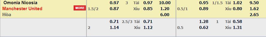 - Mức kèo nhà cái cược chấp trận này: Man Utd chấp 1,75 Trái. Omonia ăn 0,97. Man Utd ăn 0,87
