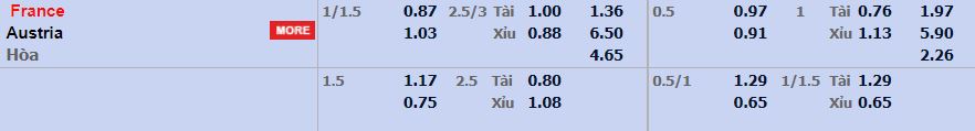 - Mức kèo nhà cái W88 cược chấp trận này: Pháp chấp 1,25 Trái. Pháp ăn 0,87. Áo ăn 1,03