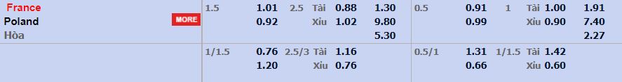 - Mức kèo nhà cái cược chấp trận này: Pháp chấp 1,5 Trái. Pháp ăn 1,01. Ba Lan ăn 0,92