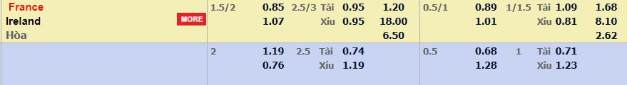 - Mức kèo nhà cái cược chấp trận này: Pháp chấp 1,75 Trái. Pháp ăn 0,85. Ireland ăn 1,07