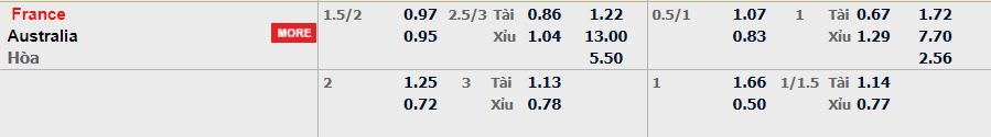- Mức kèo nhà cái cược chấp trận này: Pháp chấp 1,75 trái. Pháp ăn 0,97. Australia ăn 0,95