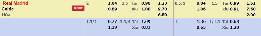 - Mức kèo nhà cái cược chấp trận này: Real Madrid chấp 2 trái. Real Madrid ăn 1,04. Celtic ăn 0,89