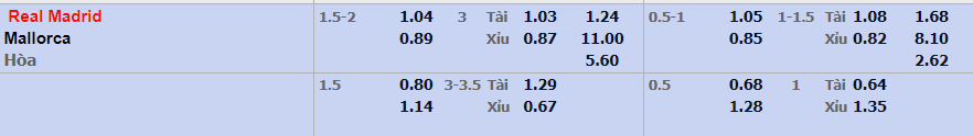 - Mức kèo nhà cái cược chấp trận này: Real Madrid chấp 1,75 Trái. Real Madrid ăn 1,04. Mallorca ăn 0,89