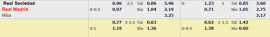 - Mức kèo nhà cái cược chấp trận này: Real Madrid chấp 0,25 Trái. Real Sociedad ăn 0,96. Real Madrid ăn 0,97