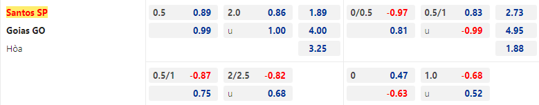 - Mức kèo nhà cái cược chấp trận này: Santos chấp 0,5 Trái. Santos ăn 0,89. Goias ăn 0,99